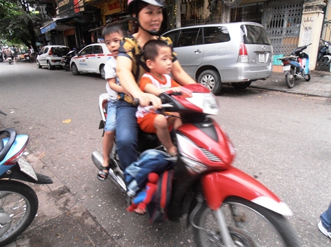 La première consiste à occuper les premières loges, juste derrière le guidon. Pour cela, les Vietnamiens ont inventé un siège destiné à être coincé entre la selle et la fourche. Niché devant l’adulte, l’enfant n’est pas peu fière d’être figure de proue du véhicule familial. Souvent, bouche et nez protégé par un masque de tissu, il ne laisse voir que ses yeux écarquillés de curiosité.