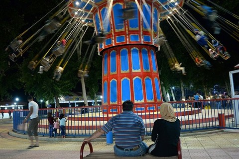 | Un couple irakien regarde des enfants s'amuser sur un manège après la rupture du jeûne, à Mossoul, le 24 mai. |