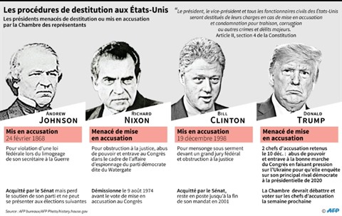 Avant lui, seuls deux présidents américains, Andrew Johnson en 1868 et Bill Clinton en 1998, ont vécu une telle épreuve. Mis en cause dans le scandale d'espionnage politique du "Watergate", le républicain Richard Nixon avait démissionné en 1974 pour éviter cet "impeachment".