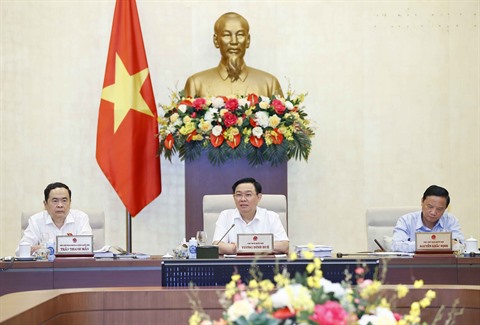 | Le président de l’AN, Vuong Dinh Huê (centre), lors d'une séance de travail du Comité permanent de l’AN, le 16 août à Hanoï. |