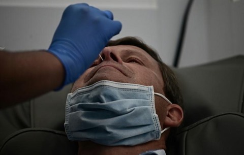 | Prélever l'échantillon pour les tests de COVID-19 à l'aéroport JFK de New York, le 29 juin. |