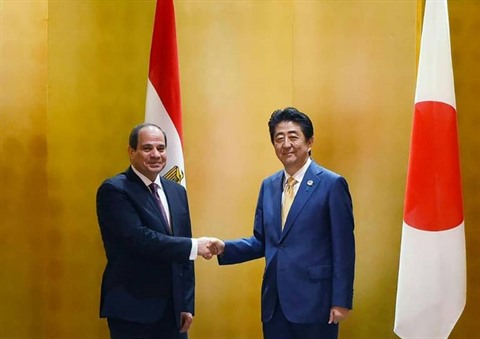 | Le président égyptien Abdel Fattah al-Sisi et le Premier ministre japonais Shinzo Abe (droite), à Osaka le 27 juin. |