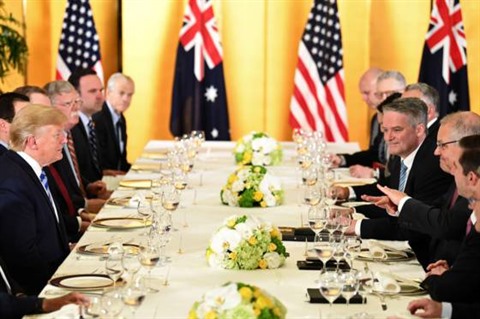 | Donald Trump dîne avec le Premier ministre australien Scott Morrison, à Osaka le 27 juin. |