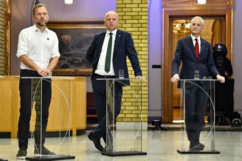 | De gauche à droite : Audun Lysbakken, de la Gauche socialiste ; Trygve Slagsvold Vedum, du Parti du Centre ; et Jonas Gahr Støre, leader du Parti travailliste, lors d'un débat le 14 septembre à Oslo. |