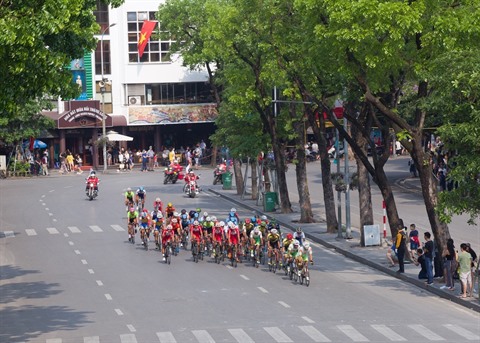 | Course cycliste au bord du lac Hoan Kiêm, à Hanoï. |