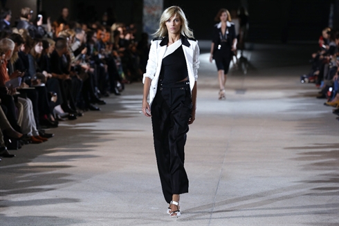 Avec Anthony Vaccarello, ça se passe la nuit, plutôt en boîte, avec des tenues ultra sexy à dominante noir et blanc. Les jupes très courtes se drapent au millimètre contrastant avec des hauts lisses et déstructurés. Robes et tops se vrillent, à charge pour de faux zips de retenir les mouvements. Les lamés au motif animal ou couleur bronze argenté renforcent ce vestiaire nocturne où l'on se doit d'être très haut perché sur des stilettos.