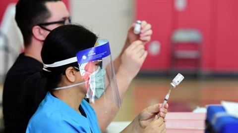 | Séance de vaccination dans un lycée de Corona (Californie), le 15 janvier 2021. |