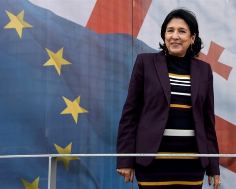 | La candidate Salomé Zourabichvili, favorite du scrutin, à Tbilissi en Géorgie, le 24 octobre. |