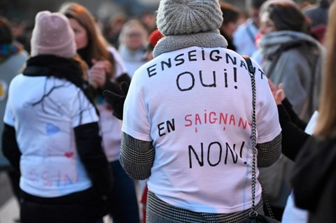 | Des professeurs manifestent contre la réforme du bac, et notamment l'organisation des épreuves de contrôle continu, le 20 janvier, au lycée René Cassin à Montfort-sur-Meu, dans l'Ouest de la France. |