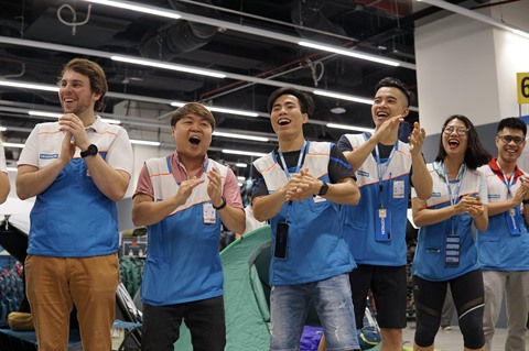 | L’équipe Decathlon Vietnam accueille ses premiers clients au magasin à Hanoï. |