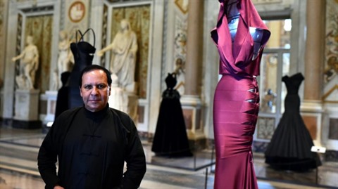 | Le couturier franco-tunisien Azzedine Alaïa pose à côté d'une de ses créations à Rome, le 10 juillet 2015. |