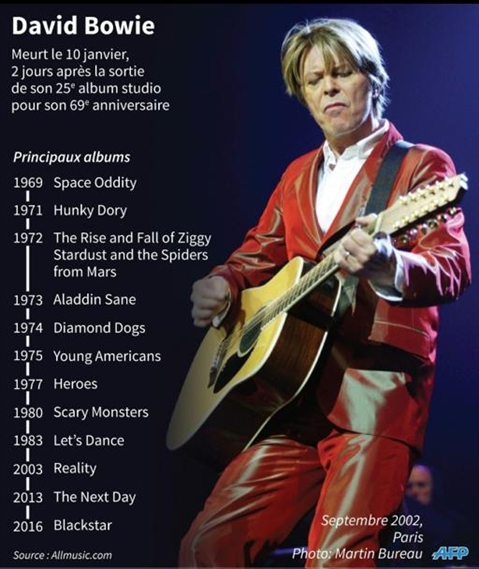 Après The Next Day sorti en 2013, son 25e et dernier album est placé sous le signe d'une mystérieuse étoile noire. "Sa mort ressemble à sa vie : une œuvre d'art", a commenté son producteur de longue date Tony Visconti. "Il a fait Blackstar pour nous, un cadeau d'adieu".