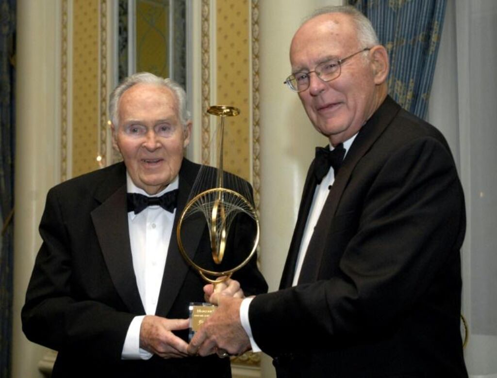 | Gordon Moore, co-fondateur du fabricant de semi-conducteurs Intel, reçoit un Marconi Society Lifetime Achievement Award de Robert Galvin (gauche), président de Motorola, en 2005 à New York. |