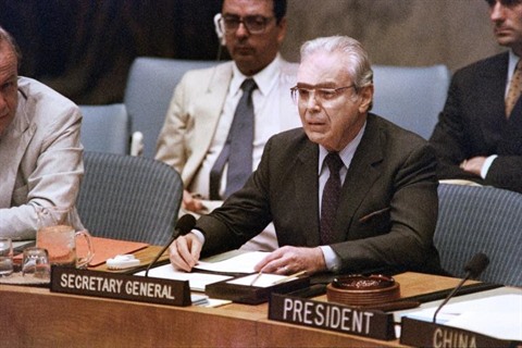 | L'ancien secrétaire général de l'ONU, le péruvien Javier Perez de Cuellar, annonce un futur cessez-le-feu entre l'Iran et l'Irak, le 8 août 1988, lors d'une réunion du Conseil de sécurité à New York. |