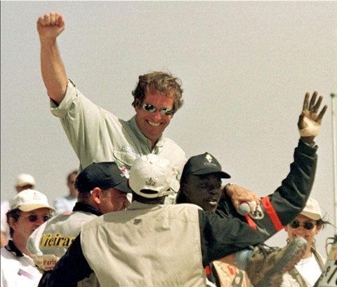 | Hubert Auriol, porté en triomphe par les concurrents du rallye-raid Paris - Dakar, le 21 janvier 2001 à l'issue de l'épreuve dans la capitale sénégalaise. |