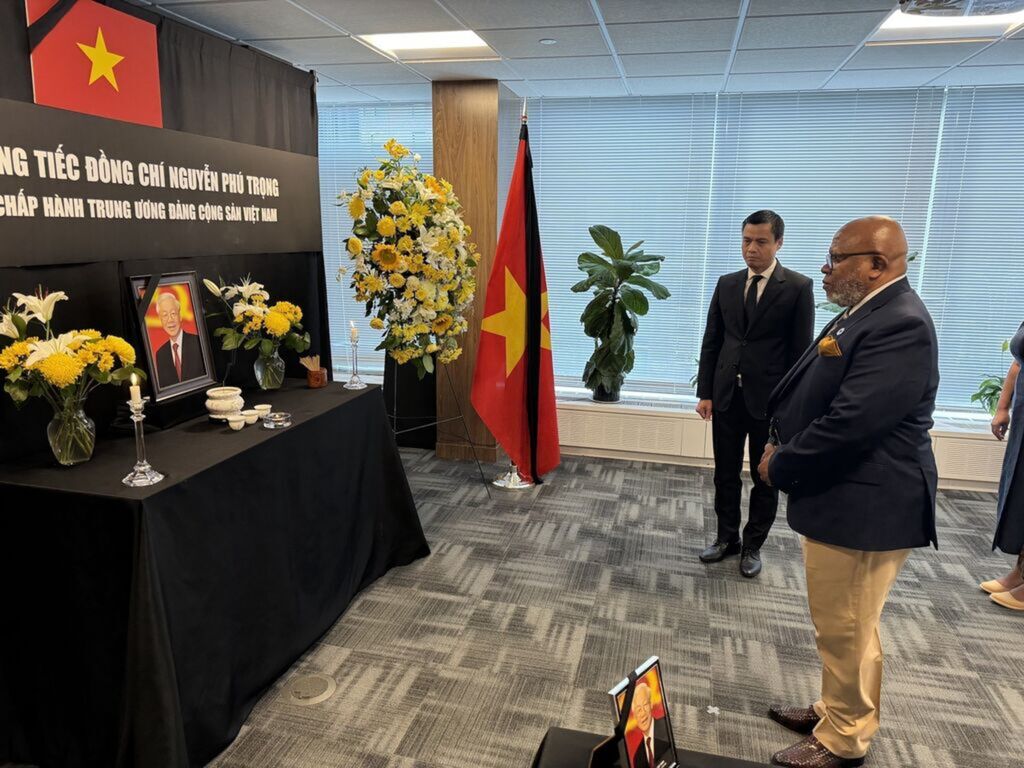 | Le président de la 78e Assemblée générale des Nations unies, Dennis Francis, rend hommage au secrétaire général Nguyên Phu Trong à la Mission permanente du Vietnam auprès de l’ONU, le 26 juillet. |