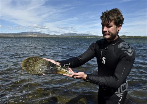 Flanqué d'un masque et d'une combinaison de plongée, Titouan Morage, ingénieur d'études au Centre de recherches insulaires et observatoire de l'environnement (CRIOBE) de Perpignan, scanne attentivement le fond de l'étang de Salses-Leucate, situé à cheval entre les départements de l'Aude et des Pyrénées-Orientales.