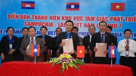 | Lors de la signature de la Déclaration commune du Forum des jeunes du Triangle de développement Cambodge-Laos-Vietnam, le 17 décembre à Binh Phuoc |