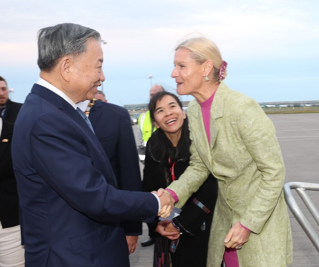 | La ministre d'État irlandaise à l'Agriculture, à l'Alimentation et à la Marine, Pippa Hackett, salue le dirigeant vietnamien Tô Lâm, à l'aéroport de Dublin, le 3 octobre. |