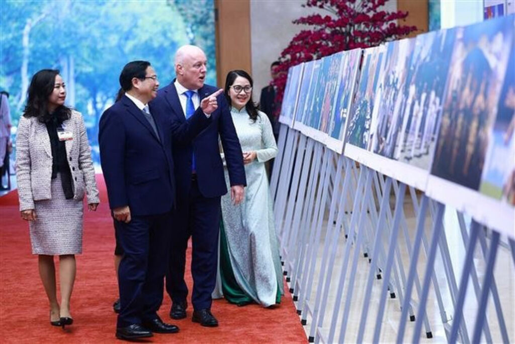 | Les Premiers ministres Pham Minh Chinh et Christopher Luxon à une exposition de photos sur les relations entre les deux pays, réalisée par la VNA, le 25 février à Hanoï. |