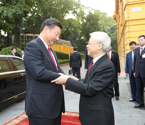 | Le secrétaire général du Parti communiste du Vietnam, Nguyên Phu Trong (droite), et le secrétaire général du Comité central du Parti communiste chinois et président chinois, Xi Jinping, le 12 novembre à Hanoï. |