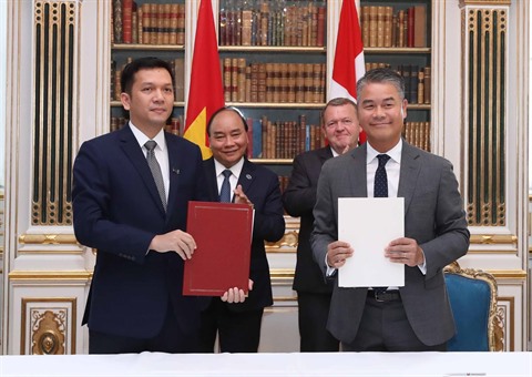 | Le Premier ministre Nguyên Xuân Phuc et son homologue danois Lars Løkke Rasmussen supervisent la signature de plusieurs documents de coopération, le 20 octobre à Copenhague. |