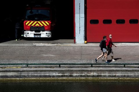 | Des promeneurs devant une caserne de pompiers le 26 avril à Paris. |