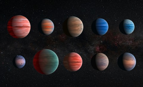 | Impression d'artiste des dix exoplanètes chaudes de Jupiter fournie par l'ESA et la NASA, le 9 décembre 2015. |