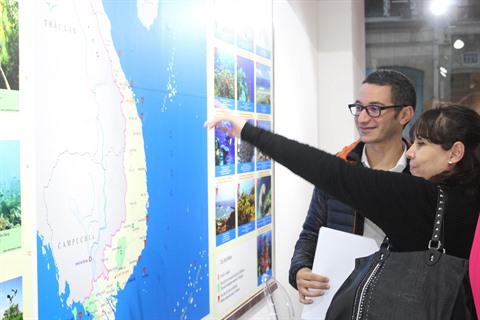 | Les visiteurs voient les photos exposées à la Galerie Joseph à Paris sur la beauté de la mer et des îles du Vietnam. |