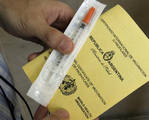 | Un certificat de vaccination du ministère argentin de la Santé et une seringue hypodermique, en janvier 2008 à Buenos Aires. |