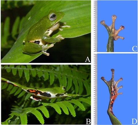 | Les rainettes de Jodi dans la nature (A et B), et ses membres antérieurs et postérieurs (C et D). |