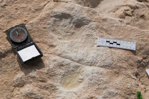 | Photo non datée de la première trace de pas humaine découverte à la surface d'un ancien lac baptisé "Alathar", en Arabie saoudite. |