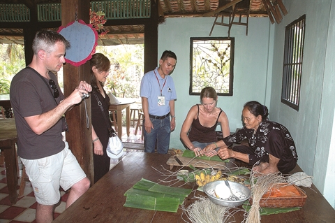| Touristes apprenant à faire le banh tet à My Tho. |