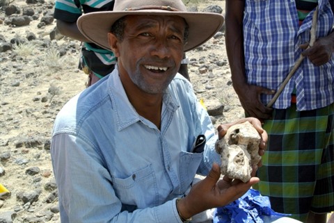 | Yohannes Haile-Selassie, du Museum of Natural history de Cleveland, pose avec un fragment du crâne de l'Australopithèque découvert en Éthiopie, le 28 août. |
