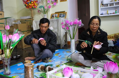 | Les habitants de Thanh Tiên ont réussi à préserver le métier de fabrication de fleurs en papier, une des nombreuses facettes culturelles de Huê. |