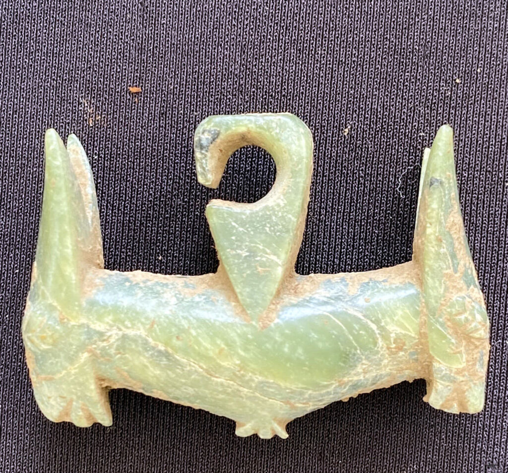 | Un morceau de boucle d’oreille en pierre en forme de deux têtes d’animaux. |