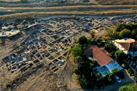 | Vue aérienne du site de fouilles de Tel Yavné, dans le centre d'Israël, où une énorme installation de production de vin a été découverte. |