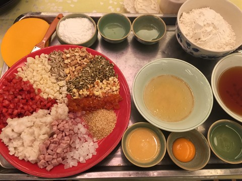 La classe commence très tôt, à 08h00. L´entrain des élèves témoigne de leur enthousiasme à suivre ce cours pour découvrir la recette du banh nuong, un gâteau farci cuit au four. Les ustensiles sont soigneusement préparés par l’hôtel Métropole Hanoi et, devant chaque participant, un plateau est déposé. Tous les ingrédients nécessaires à la préparation sont réunis: farine, eau, jaunes d’œufs, jaunes d’œufs salés, lard sucré, graines de courge torréfiés, graines de lotus sucrés, lap cheong (saucisse chinoise), graines de sésame torréfiés, cacahouètes, noix de cajou grillés, graines de tournesol grillées, jambon sauté avec du sucre, zestes d’oranges confits, kumquats confits, feuilles de citron coupées en juliennes…Le tout organisé méthodiquement afin de pouvoir s´y retrouver pendant la préparation.