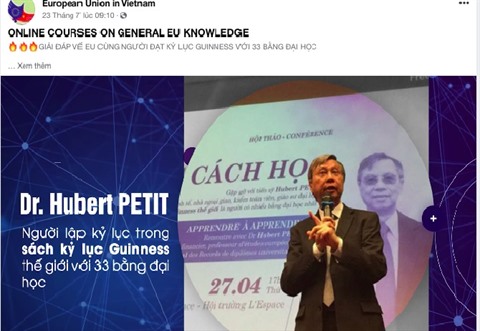 Cette année, sous l'influence de la pandémie de COVID-19, le cours de juillet dernier a été dispensé en ligne, sur la plateforme de visioconférences Google Meet. Les parties les plus importantes du cours ont été enregistrées et montées pour créer de courtes vidéos sous-titrées en vietnamien et publiées sur Youtube : https://www.youtube.com/channel/UCZj72Z6rHgbud3hJLJNL00w et sur la fanpage de l’UE au Vietnam : https://www.facebook.com/EUandVietnam/.