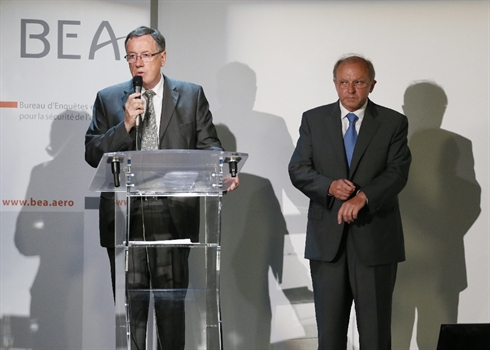 | Alain Bouillard (gauche), directeur de l'enquête du BEA, et Jean-Paul Troadec, directeur du BEA le 5 juillet lors d'une conférence de presse. |