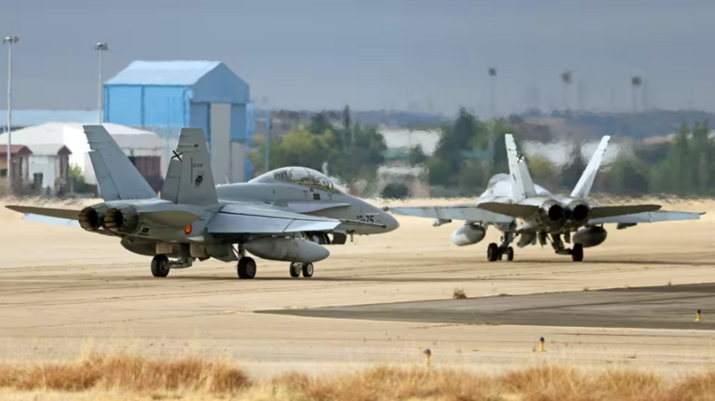 | Des avions militaires espagnols s'apprêtent à décoller à la base militaire de Torrejon de Ardoz à Madrid (Espagne), le 12 octobre. |