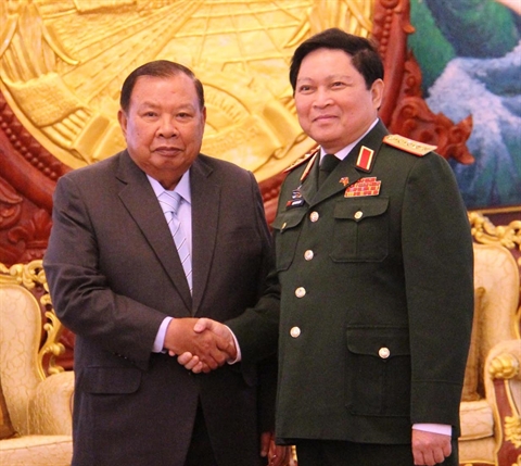 | Le secrétaire général du PPRL et président lao Bounnhang Vorachith (gauche) et le ministre vietnamien de la Défense, Ngô Xuân Lich |