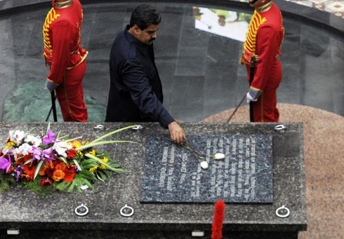 | Le président du Venezuela, Nicolas Maduro, rend hommage à Hugo Chavez, un an après sa disparition, le 5 mars à Caracas. |