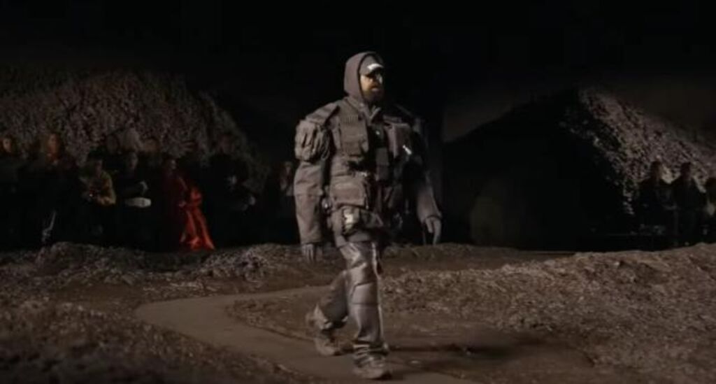 Casquette sous une capuche, pantalon en cuir et veste noire avec des poches multiples, chaussé de grosses baskets, l'artiste américain et ami du styliste géorgien de Balenciaga, Demna, Kanye West, a inauguré le show à Villepinte, au nord de Paris, loin du faste de la Fashion week.