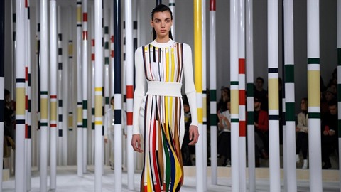 Les mannequins ont évolué au milieu de barres blanches verticales marquées par des lignes rouges, jaunes, vertes et noires comme sorties des tableaux destructurés du peintre néerlandais, l'un des pionniers de l'abstraction.