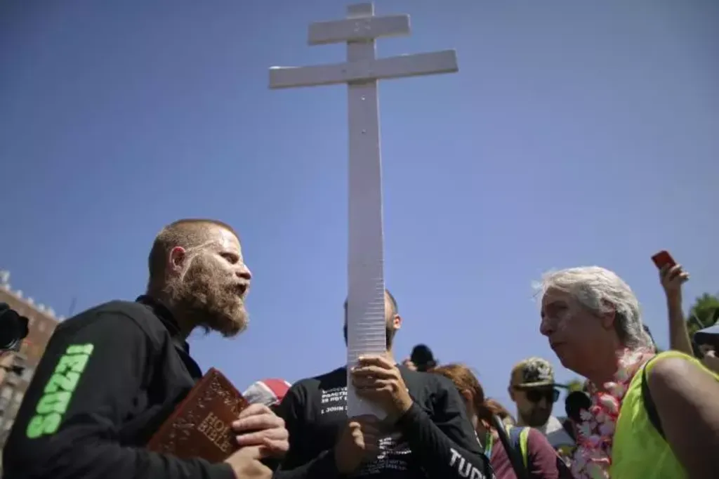 | Lors de la marche des fiertés à Budapest le 28 juin 2025. Des opposants avec une bible et une croix. |