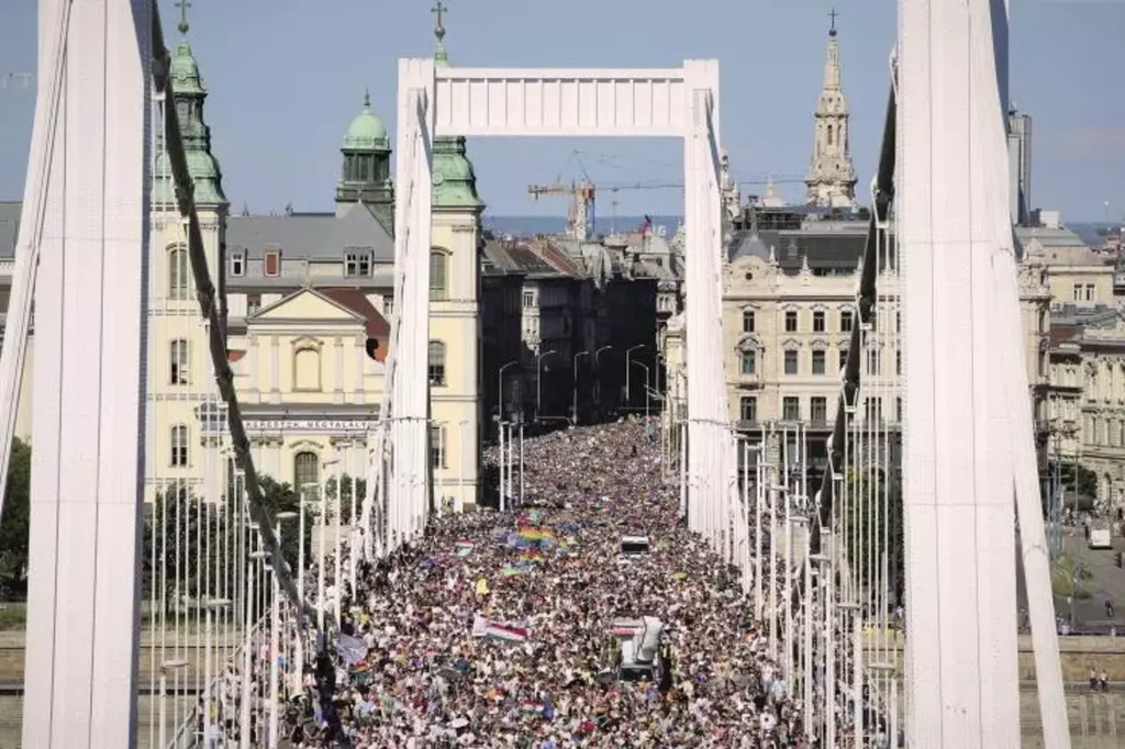 | Une vue spectaculaire de la marche des fiertés sur le célèbre pont Elisabeth qui relie les deux rives de Budapest, ce samedi 28 juin. |