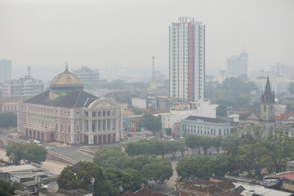 | Vue du théâtre de Manaus, capitale de l'Amazonie brésilienne, envahie depuis des jours par la fumée d'incendies provoqués à des fins de déforestation, le 13 octobre. |
