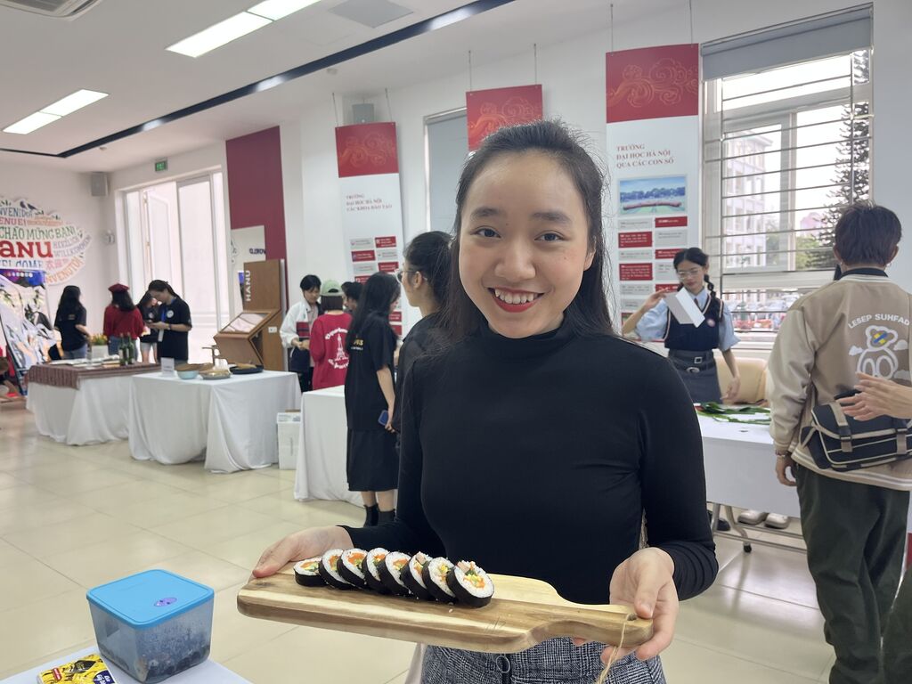 Nguyên Phuong Linh, étudiante de la classe 2TT21, arrange les morceaux de kimbap sur des tranchoirs en bois en forme de fleurs. En représentant la Corée du Sud, son équipe a choisi le kimbap pour ce concours. "Notre équipe, composée de cinq membres, a préparé 30 rouleaux de kimbap en deux heures. Nous avons appris la recette de ce plat en regardant des vidéos sur Internet. Ce plat n'est pas trop difficile, mais nous avons dû le refaire plusieurs fois", partage Phuong Linh. Elle ajoute également que "kim" signifie algue et "bap" signifie riz en coréen. Les Coréens préparent le kimbap pour les repas quotidiens, les pique-niques et les événements en plein air. Ce plat se compose d’algues, de riz blanc gluant, de radis marinés, d’œufs au plat, de carottes, et de saucisses ou de thon.