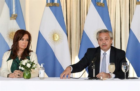 | Le président argentin Alberto Fernandez et la vice-présidente Cristina Kirchner lors d'une conférence à Buenos Aires, le 16 avril |